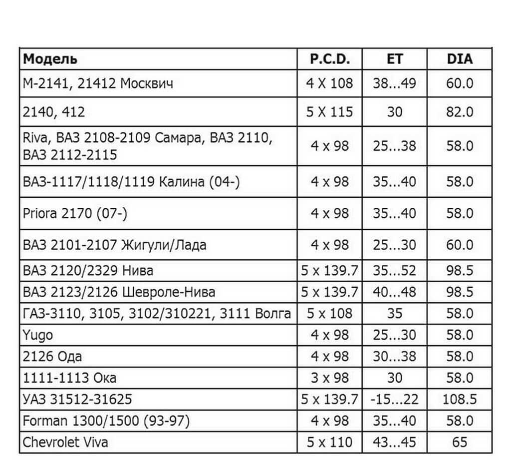 Таблица совместимости разболтовки колесных дисков